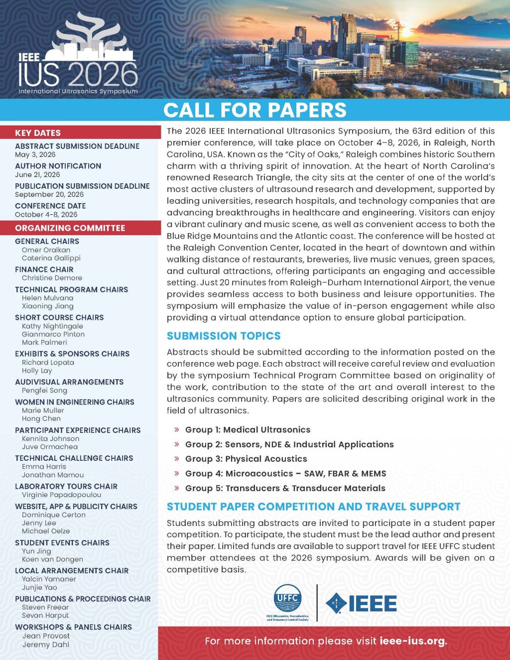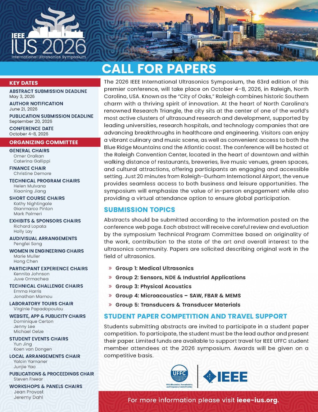Students submitting abstracts are invited to participate in a student paper competition. To participate, the student must be the lead author and present their paper. Limited funds are available to support travel for IEEE UFFC student member attendees at the 2026 symposium. Awards will be given on a competitive basis.